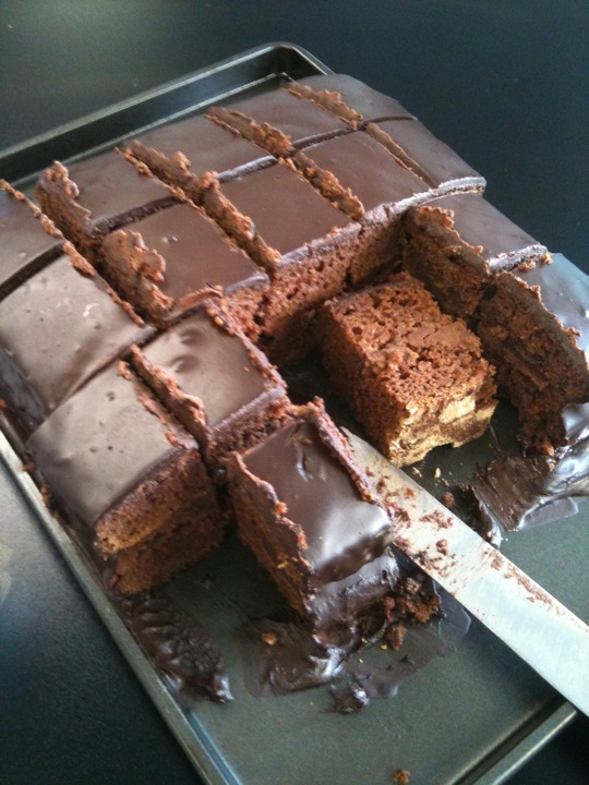 6. Let the frosting spill over the sides onto the foil or baking sheet.