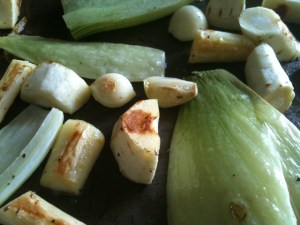 - In a bowl, coat the fennel, garlic, and parsnips with 1 Tbsp. of fat and season with some salt and pepper