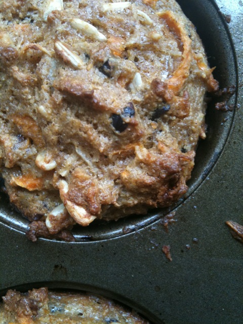So, yesterday in my gloomy mood, I made a superfood/paleo version of a popular muffin called Morning Glory. These muffins are known for being healthier than the average muffin. They are chock full of nuts, diced apple, carrots, raisins and wheat bran. They have a lovely name too. However, the non-glorious weather encouraged me to name my version Morning Gloomy Muffins. They will not make you feel gloomy. They don’t taste gloomy. But as someone who does not regularly eat baked goods, these will probably only get made when it’s gloomy outside.