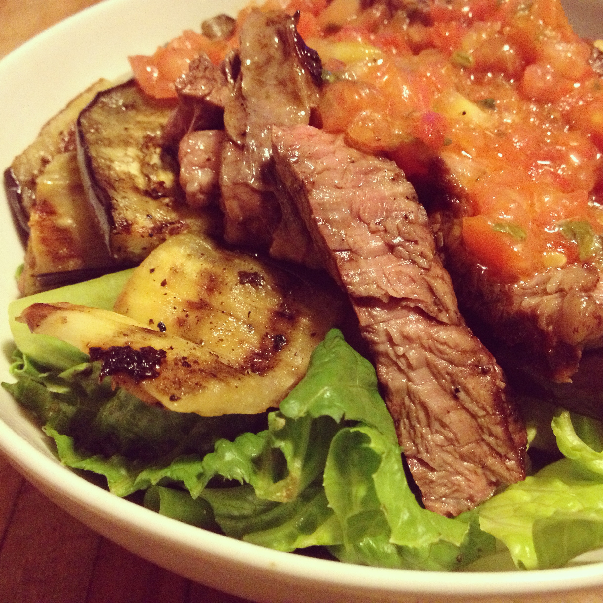 - While the steak rests, chop up your romaine, grilled eggplant, and onions.