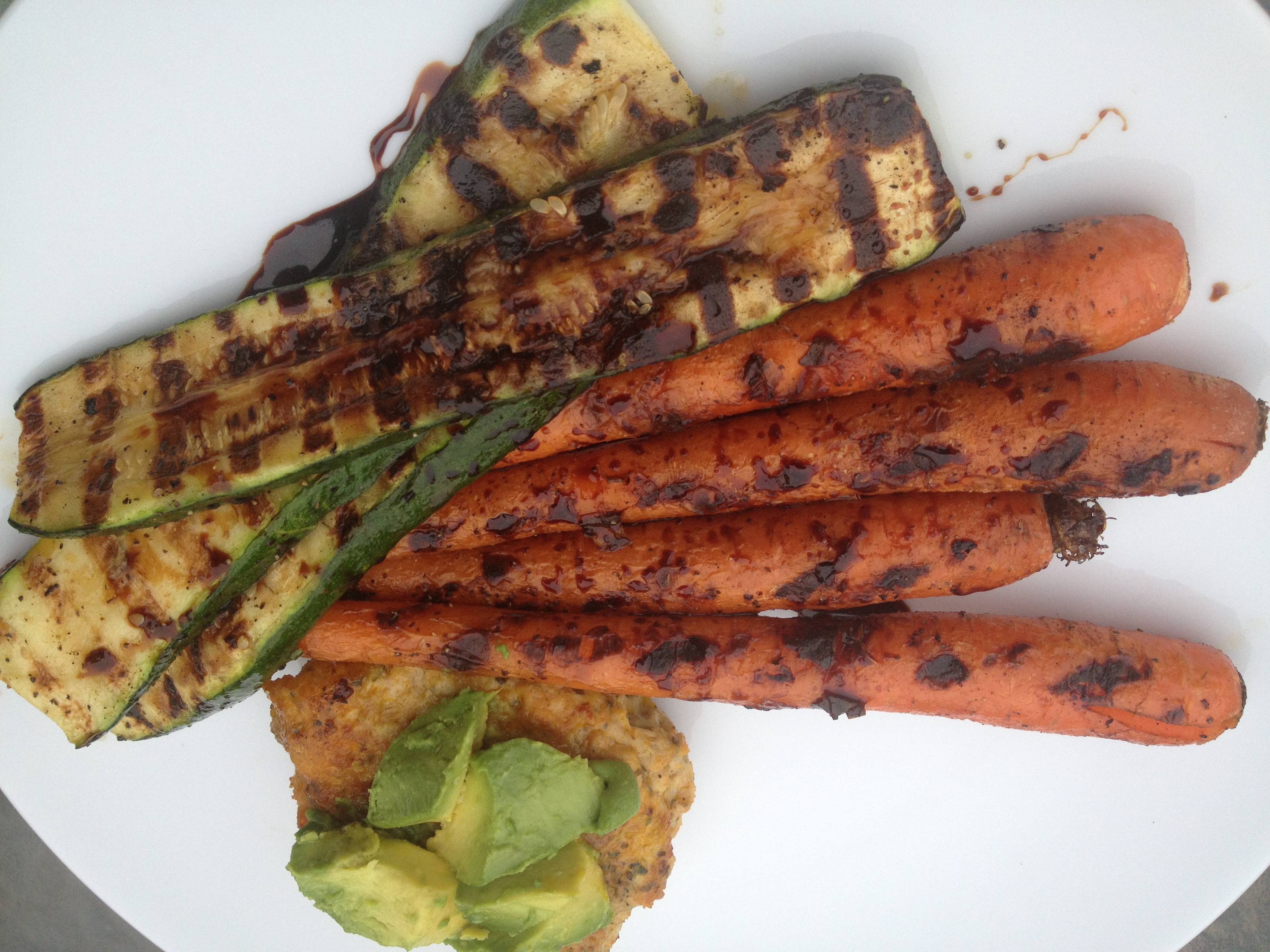 … while I prepared my dinner of turkey burgers (fried in Red Palm Oil) and grilled carrots and zucchini with a drizzle of balsamic glaze.