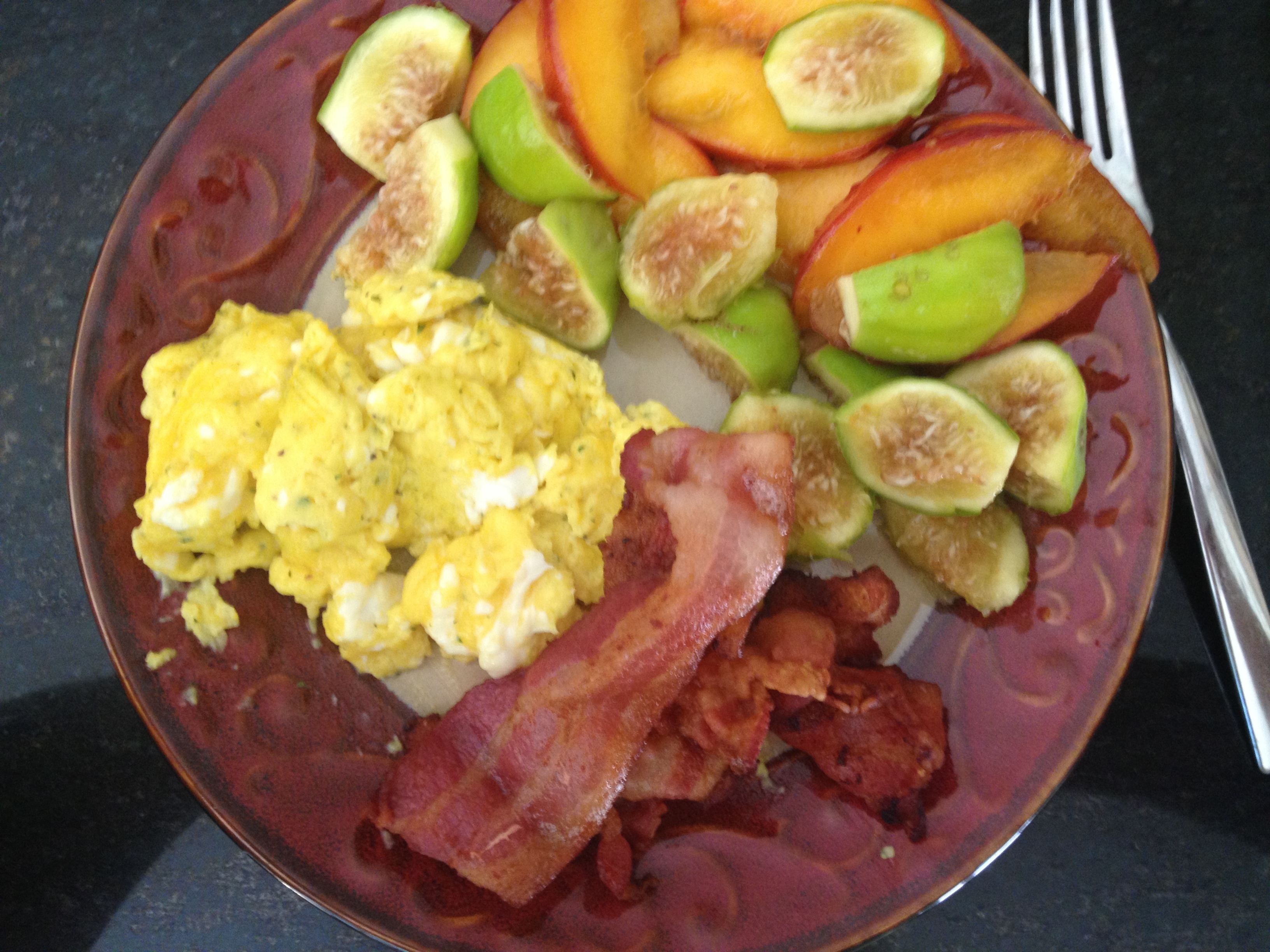 Yesterday, after a morning of coffee with coconut cream I headed up the freeway for my breakfast. I was especially excited for this meal because I was going to be in the company of my best buddy. She and I went for a walk out in the sun and then we prepared a delicious breakfast of fresh figs (FIGS!!!!), peaches, bacon, and scrambled eggs (fresh from the chickens!). Pro tip: whisk herbs and seasonings into the eggs as well as a bit of water.