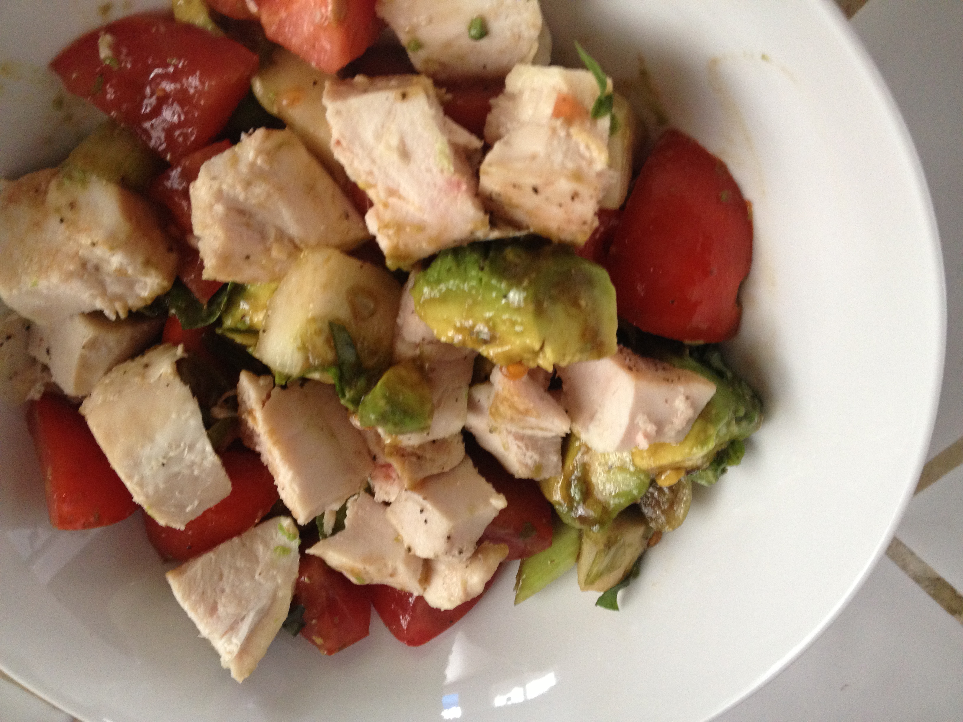 After shopping, I had obviously worked up an appetite (note the grumpy, non-smiley face), so I dropped by the garden to feed the chickens and grab some heirloom tomatoes. I came home and whipped up a fresh Heirloom Tomato, Cucumber, Avocado, and Basil Salad with some chopped chicken.