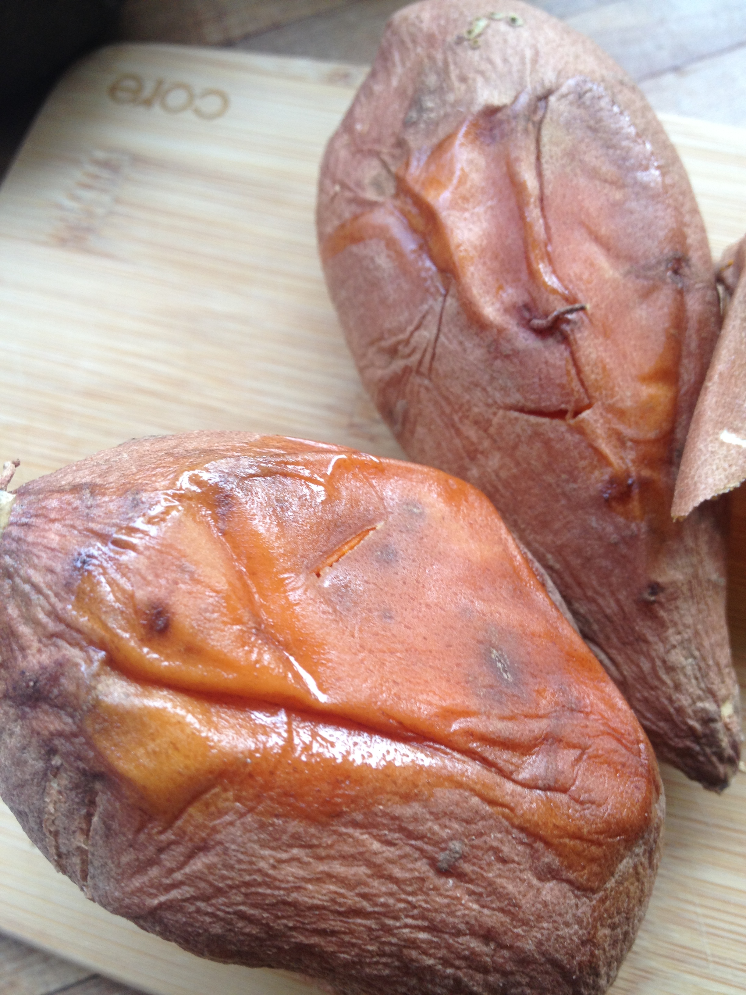 - Once yams are done, and have cooled for a bit, remove the skin and place in your food processor or high-speed blender.