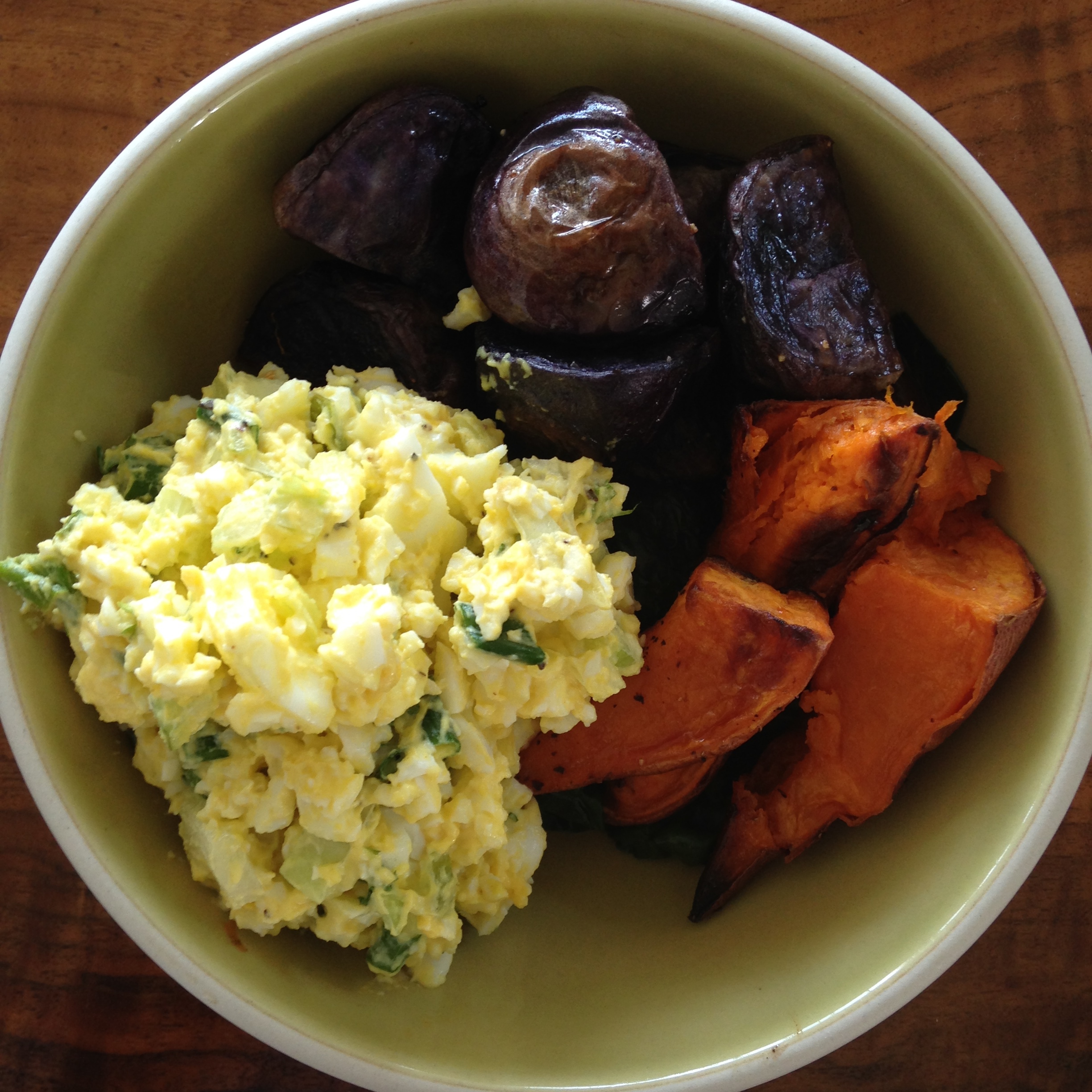 Lunch: Egg Salad over steamed kale with 1 c. purple potatoes and 1/2 c. yam spears
