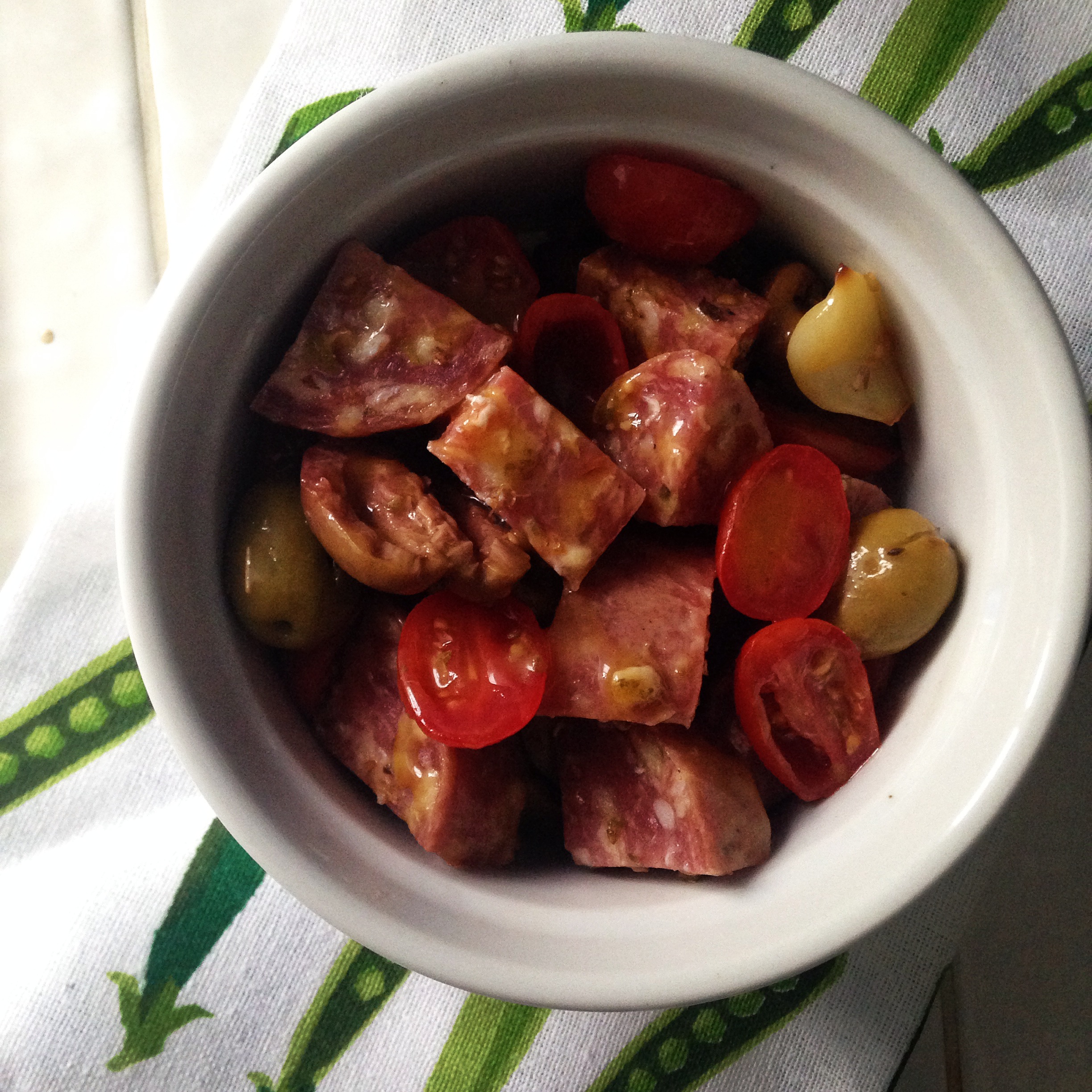 1 medium log salami, chopped (check for weird preservatives and dairy in case you are sensitive)