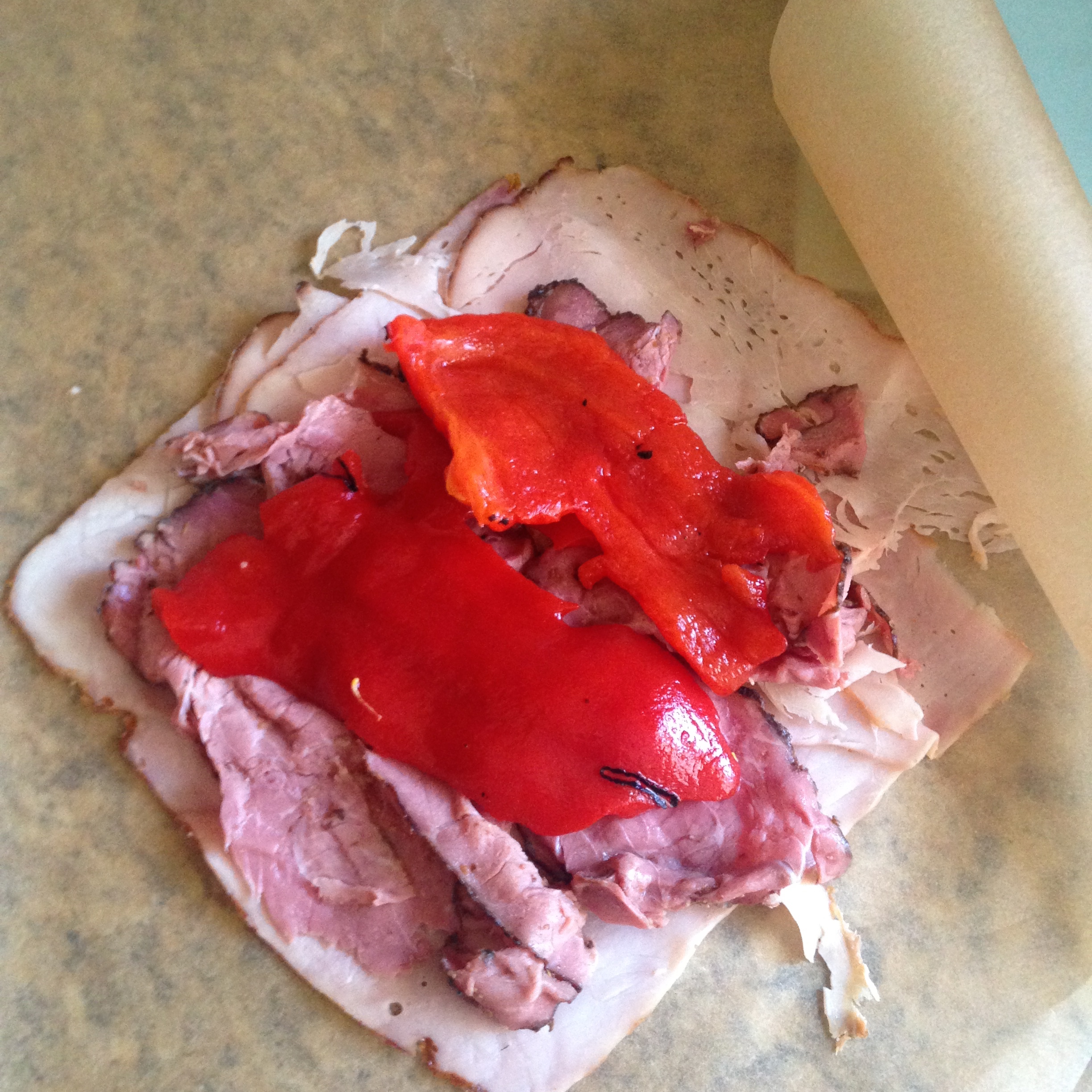 - Layer and stagger the meats on a large square (have a point of the square facing you … like a diamond) of parchment paper.